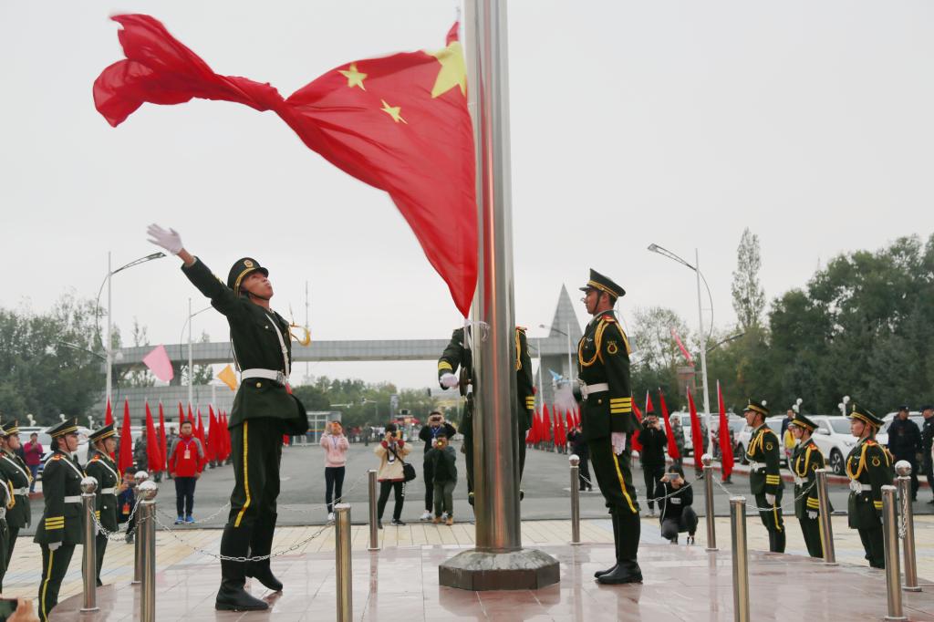 上午9时,升旗仪式正式开始。国旗护卫队迈着整齐的步伐,护送国旗走向升旗台,在豪迈雄壮的义勇军进行曲中,鲜艳的五星红旗冉冉升起,在晨风中高高飘扬。师生们满怀豪迈之情,庄严地向国旗行注目礼,高唱国歌,表达对伟大祖国的崇敬和热爱之情,为伟大祖国送上深情祝福,共同祝愿伟大祖国繁荣昌盛。