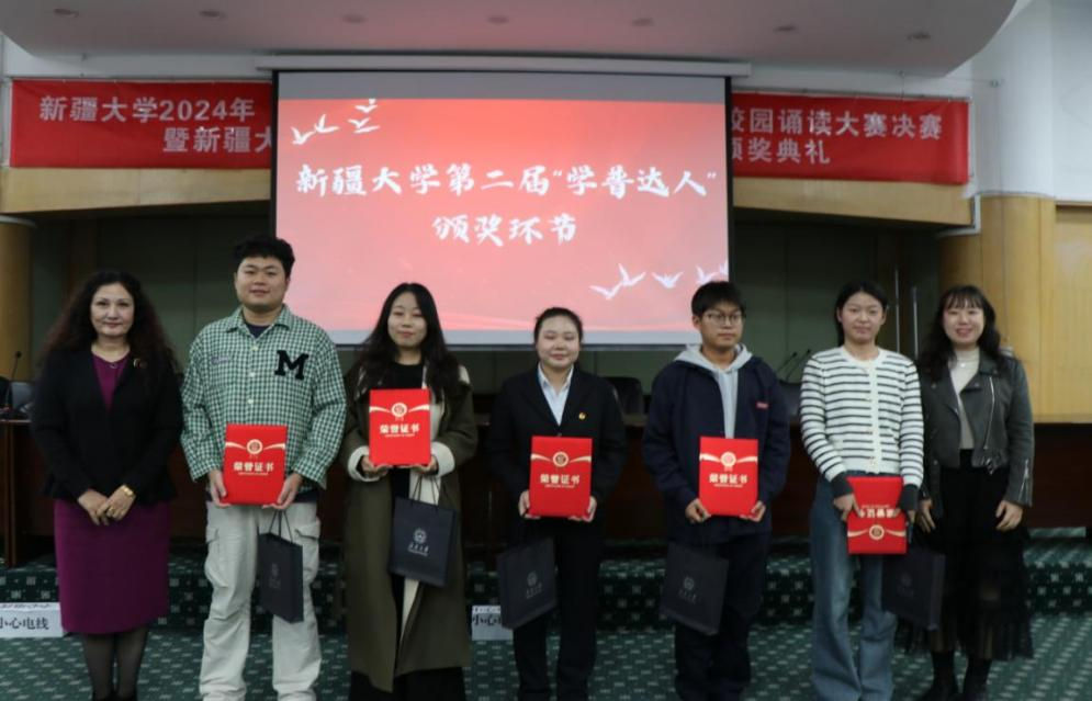 10 月 16 日下午,AOA体育官方网站第二届“推普达人”颁奖活动于九号教学楼二楼学术报告厅举行,共青团AOA体育官方网站委员会艾比巴·卡地尔老师、国家语言文字推广基地(AOA体育官方网站)副主任高立明副教授、国家语言文字推广基地(AOA体育官方网站)办公室主任焦妍老师出席颁奖式并为获奖人员颁发了荣誉证书和奖品。