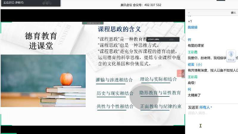 为了深入贯彻习近平新时代中国特色社会主义思想,落实立德树人根本任务,将思政教育有机融入专业课程教学和改革,4月18日,外国语学院利用“腾讯会议”和“雨课堂”举办了第十一期“CETL外语教师行动研究工作坊”。外国语学院全体教职工和部分研究生参加了此次活动。